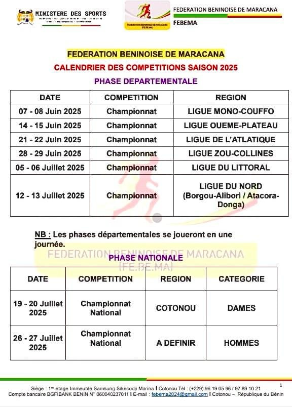LA FEDERATION BENINOISE DE MARACANA DEVOILE LE CALENDRIER DE LA SAISON 2025